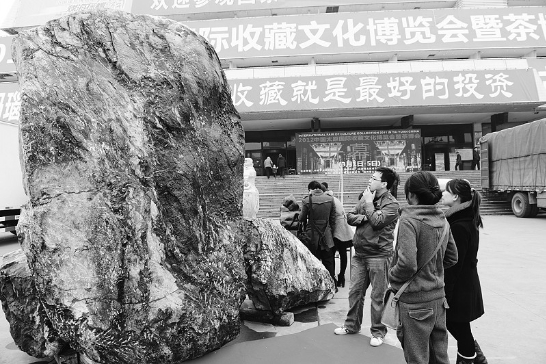 3月1日,參觀者在展場(chǎng)觀賞重達(dá)11.9噸的巨型“泰山玉王”。當(dāng)日,2012太原國(guó)際收藏文化博覽會(huì)暨茶博會(huì)在中國(guó)煤炭博物館開(kāi)幕,來(lái)自國(guó)內(nèi)的參展商展出了珠寶玉石、奇石書(shū)畫(huà)、瓷器紫砂、紅木家具、茶葉等上百種收藏品。(來(lái)源:山西日?qǐng)?bào))