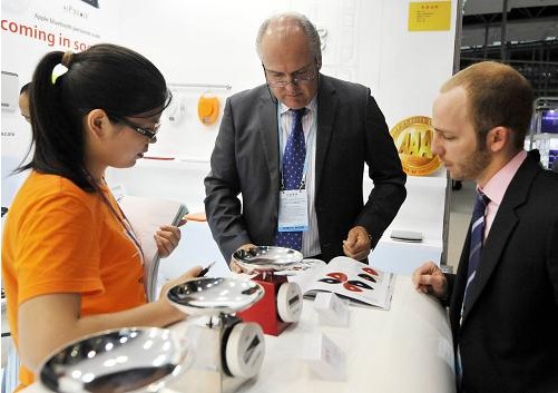 在廣交會一期上,兩位采購商在一個電子秤展位前瀏覽產品介紹。為期5天的廣交會第一期于4月19日結束。受歐債危機隱憂持續(xù)、歐元區(qū)經濟衰退風險加劇以及新興經濟體面臨通貨膨脹和經濟增速回落疊加影響,本屆廣交會一期成交較上年同期和上一屆,均有一定幅度的下滑。據(jù)統(tǒng)計,機電產品累計成交額188億美元,占全部成交額的83.9%,較上年春季廣交會同期下降5.5%,較第110屆秋交會下降9.5%。