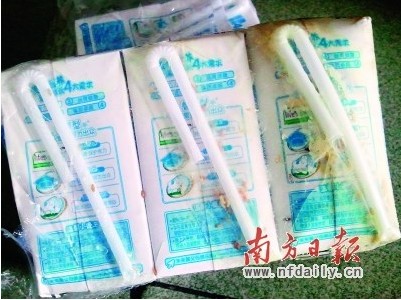 4月19日晚,家住東莞長安錦廈新村的謝先生經(jīng)不住兒子的央求,在附近的百佳超市買了一箱生產(chǎn)日期標明為“20120302”的蒙牛兒童牛奶回家??蓴?shù)日后他才發(fā)現(xiàn),箱內(nèi)部分未拆包裝的牛奶外殼上長滿蟲子,這讓全家人對已喝了幾盒這箱牛奶的兒子的健康擔心不已。