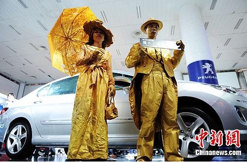 5月3日,以“樂享生活”為主題的2012湖南車展在湖南國際會展中心開幕。參展商們?yōu)槲M(fèi)者,各想奇招。在某品牌汽車展區(qū)前,兩位裝扮成活體雕塑的人手拿車牌進(jìn)行促銷,吸引了眾多消費(fèi)者的眼球。(來源:中新網(wǎng))