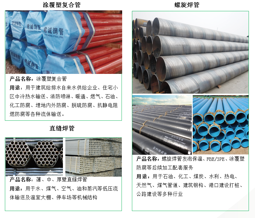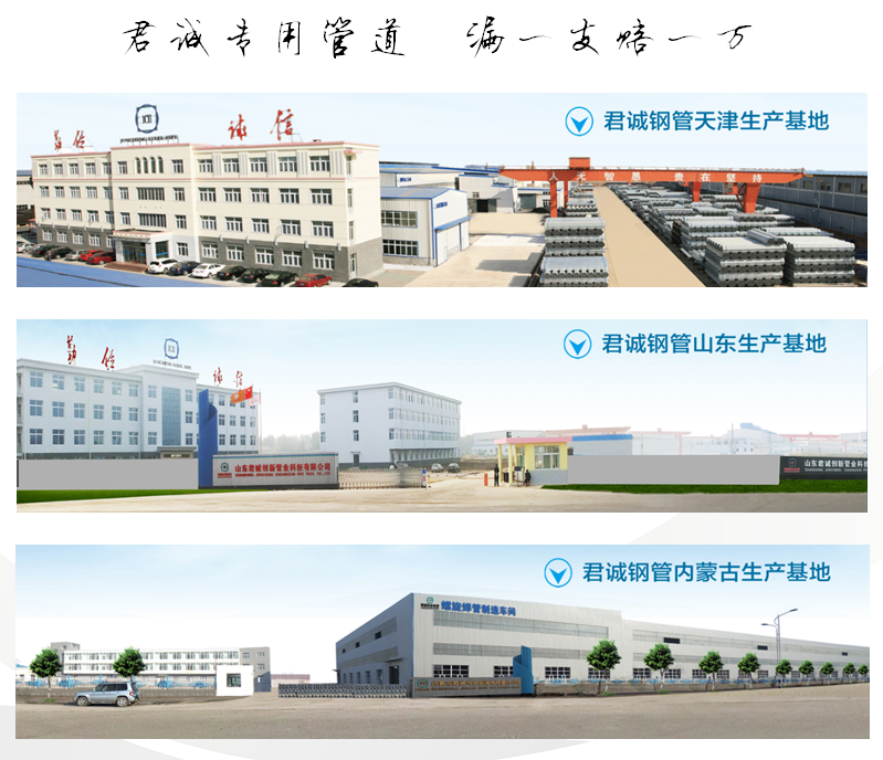 君誠(chéng)管道集團(tuán)是中國(guó)制造業(yè)企業(yè)500強(qiáng)、中國(guó)民營(yíng)企業(yè)制造業(yè)500強(qiáng)和中國(guó)產(chǎn)地名牌產(chǎn)品企業(yè)。集團(tuán)公司總部在北京,產(chǎn)銷(xiāo)基地坐落在——天津蔡公莊工業(yè)園區(qū)、山東焦橋南部工業(yè)園區(qū)和內(nèi)蒙古包頭九原工業(yè)園區(qū)。各子公司總占地近800畝,資產(chǎn)總計(jì)二十余億元,擁有熱鍍鋅鋼管生產(chǎn)線(xiàn)16條、直縫焊接鋼管生產(chǎn)線(xiàn)20條、襯塑復(fù)合管生產(chǎn)線(xiàn)11條、涂覆塑復(fù)合管生產(chǎn)線(xiàn)6條、螺旋縫雙面埋弧焊鋼管生產(chǎn)線(xiàn)6條、方矩鋼管生產(chǎn)線(xiàn)5條,以及預(yù)涂覆熱浸鋅鋼管、管接件等其他生產(chǎn)制造設(shè)施。君誠(chéng)管道在全國(guó)產(chǎn)品行業(yè)規(guī)模綜合處于前列,制定中國(guó)鋼管?chē)?guó)家標(biāo)準(zhǔn)——《低壓流體輸送用焊接鋼管》(GB/T3091)、國(guó)家電網(wǎng)系統(tǒng)《輸電線(xiàn)路鋼管塔用直縫焊管》、《直縫電焊鋼管》(GB/T13793)、《國(guó)家電網(wǎng)特高壓輸電線(xiàn)路用管》、《給水涂塑復(fù)合鋼管》(CJ/T 120)、《國(guó)家排水用小螺距鋼塑復(fù)合用管》、《內(nèi)襯內(nèi)覆不銹鋼復(fù)合鋼管管道工程技術(shù)規(guī)程》、《鋼塑復(fù)合管》(GB/T28897)等標(biāo)準(zhǔn)。年設(shè)計(jì)生產(chǎn)能力Φ21-Φ219mm熱鍍鋅鋼管120萬(wàn)噸、Φ21-Φ273mm直縫焊管180萬(wàn)噸、Φ219-Φ3020mm螺旋鋼管30萬(wàn)噸、鋼塑復(fù)合管20萬(wàn)噸、方矩鋼管20萬(wàn)噸,以及預(yù)涂覆熱浸鋅鋼管、管接件等各類(lèi)管道和其他相關(guān)產(chǎn)品年制造能力近400萬(wàn)噸。