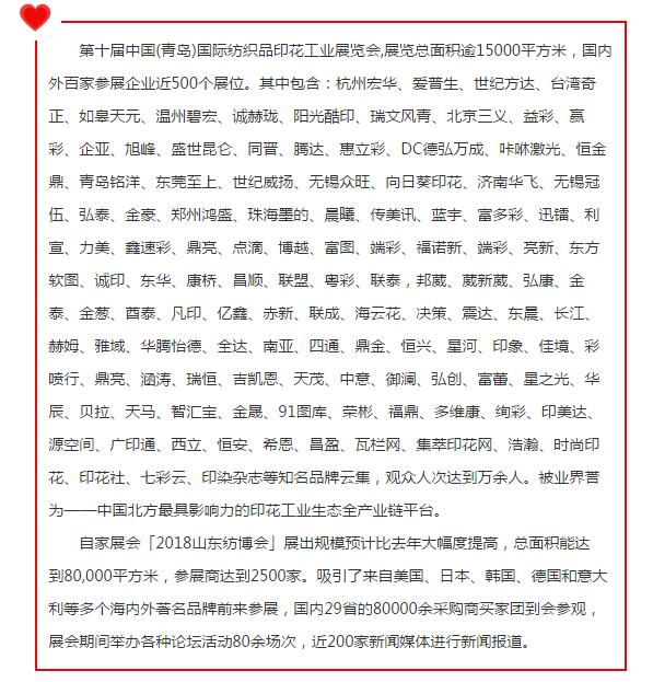 第十屆中國(青島)國際紡織品印花工業(yè)展覽會,展覽總面積逾15000平方米,國內(nèi)外百家參展企業(yè)近500個展位。其中包含:杭州宏華、愛普生、世紀方達、臺灣奇正、如皋天元、溫州碧宏、誠赫瓏、陽光酷印、瑞文風(fēng)青、北京三義、益彩、贏彩、企亞、旭峰、盛世昆侖、同晉、騰達、惠立彩、DC德弘萬成、咔咻激光、恒金鼎、青島銘洋、東莞至上、世紀威揚、無錫眾旺、向日葵印花、濟南華飛、無錫冠伍、弘泰、金豪、鄭州鴻盛、珠海墨的、晨曦、傳美訊、藍宇、富多彩、迅鐳、利宣、力美、鑫速彩、鼎亮、點滴、博越、富圖、端彩、福諾新、端彩、亮新、東方軟圖、誠印、東華、康橋、昌順、聯(lián)盟、粵彩、聯(lián)泰,邦葳、葳新葳、弘康、金泰、金蔥、酋泰、凡印、億鑫、赤新、聯(lián)成、海云花、決策、震達、東晨、長江、赫姆、雅域、華騰怡德、全達、南亞、四通、鼎金、恒興、星河、印象、佳境、彩噴行、鼎亮、涵濤、瑞恒、吉凱恩、天茂、中意、御瀾、弘創(chuàng)、富蕾、星之光、華辰、貝拉、天馬、智匯寶、金晟、91圖庫、榮彬、福鼎、多維康、絢彩、印美達、源空間、廣印通、西立、恒安、希恩、昌盈、瓦欄網(wǎng)、集萃印花網(wǎng)、浩瀚、時尚印花、印花社、七彩云、印染雜志等知名品牌云集,觀眾人次達到萬余人。被業(yè)界譽為——中國北方最具影響力的印花工業(yè)生態(tài)全產(chǎn)業(yè)鏈平臺。