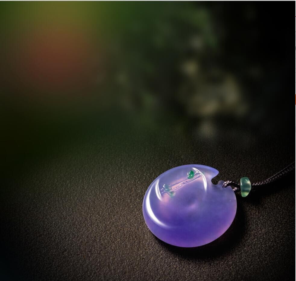 紫羅蘭翡翠平安扣左上方有綠色點(diǎn)綴,俏色雕刻,營造出一種靜謐的境界。紫與綠相伴相隨,任時(shí)光荏苒,不離不棄。從作品中感受生活、記憶、片段……透過這件作品想到人生中的點(diǎn)點(diǎn)滴滴。