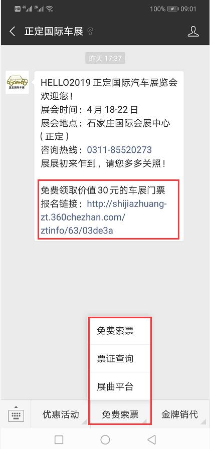 關注“正定國際車展”微信公眾號,選擇“免費索票”,輸入相關信息即可免費獲取價值30元的車展門票;或點擊自動回復報名鏈接進行索票。
