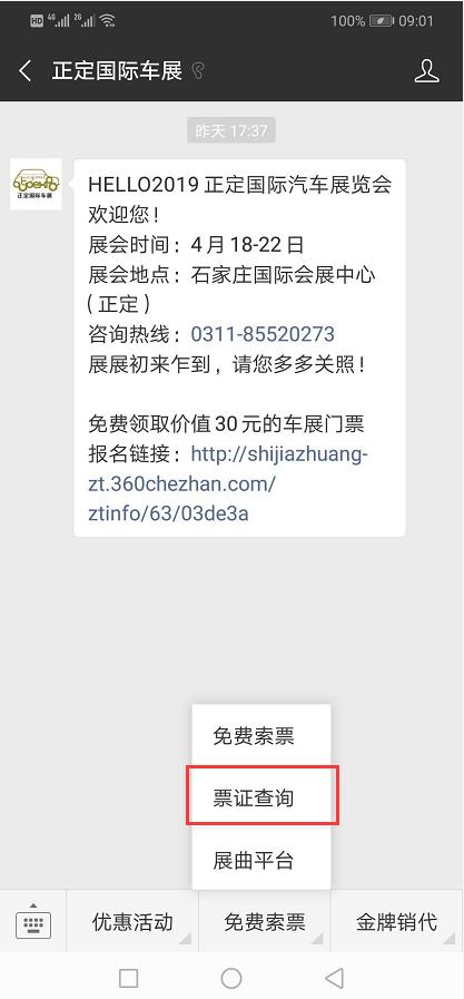 關注“正定國際車展”微信公眾號,點擊“免費索票”選擇“票證查詢”,輸入相關信息,即可查票。