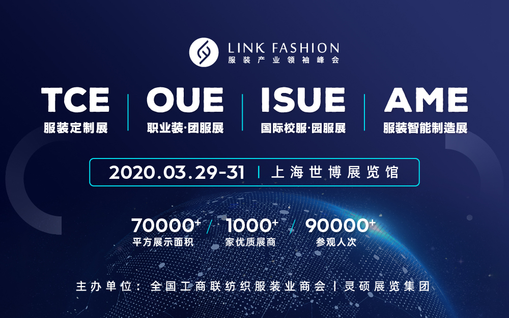 由中華全國工商聯(lián)紡織服裝業(yè)商會與靈碩展覽集團主辦的“2020 全球服裝產(chǎn)業(yè)領(lǐng)袖峰會”融合旗下四大品牌展會TCE 服裝定制展,OUE 職業(yè)裝 • 團服展,ISUE 國際校服 • 園服展,AME 服裝智能制造展,將于 2020 年 3 月 29-31日在上海世博展覽中心舉行, 超過 70000 ㎡展示面積,1000+優(yōu)質(zhì)參展商,90000+ 參觀人次,超 20 場會議活動。 屆時將匯聚國內(nèi)外紡織服裝行業(yè)精英領(lǐng)袖,傾力打造全球服裝產(chǎn)業(yè)頂級盛會。