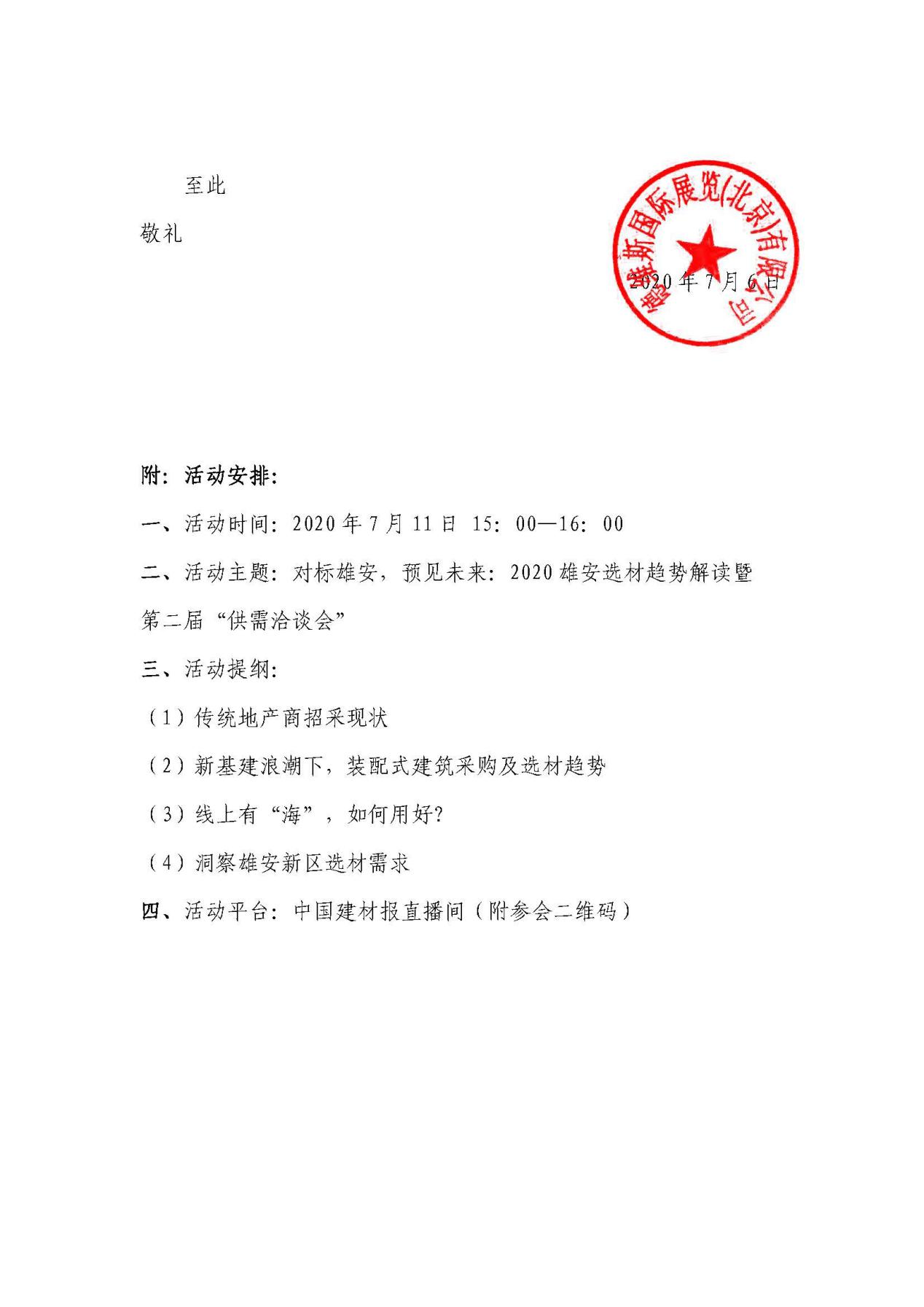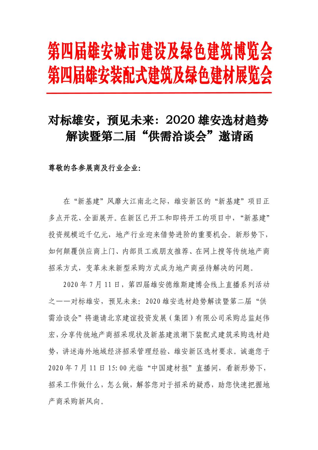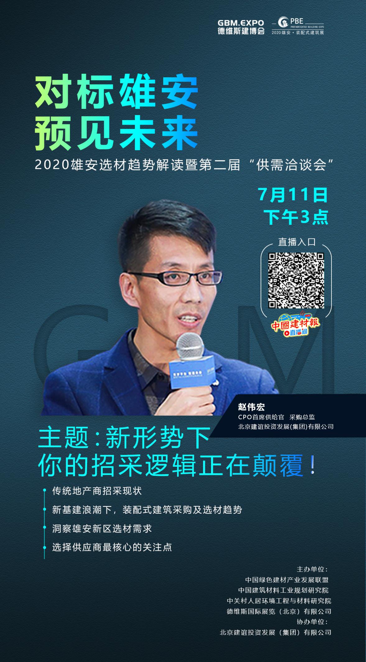2020年7月11日,第四屆雄安德維斯建博會線上直播系列活動之——對標雄安,預(yù)見未來:2020雄安選材趨勢解讀暨第二屆“供需洽談會”將邀請北京建誼投資發(fā)展(集團)有限公司采購總監(jiān)趙偉宏,分享傳統(tǒng)地產(chǎn)商招采現(xiàn)狀及新基建浪潮下裝配式建筑采購選材趨勢,講述海外地域經(jīng)濟招采管理經(jīng)驗、雄安新區(qū)選材要求。
