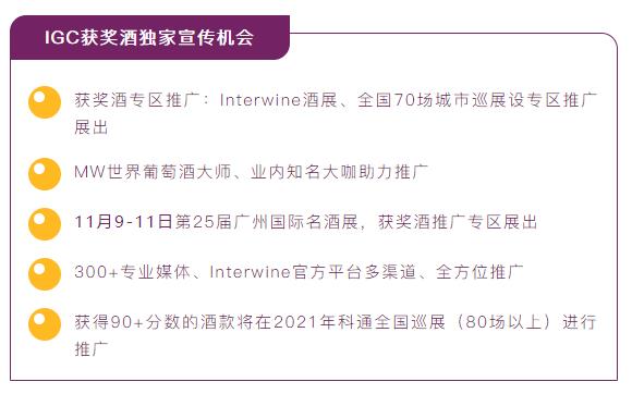 Interwine是中國最早、影響力最大的專業(yè)國際葡萄酒及烈酒展覽,旗下Interwine 葡萄酒與烈酒大獎賽(簡稱IGC)作為中國最權(quán)威公正的葡萄酒大賽之一,對中國葡萄酒消費(fèi)市場影響深遠(yuǎn)。IGC旨在對釀酒廠商勤懇勞作進(jìn)行表彰加冕,全力幫助進(jìn)入中國市場的國內(nèi)外酒商建立起自己的品牌知名度和美譽(yù)度,搭建釀酒者和消費(fèi)者之間的互聯(lián)互通的橋梁,推動國際和國內(nèi)葡萄酒行業(yè)向前發(fā)展。2020 IGC已正式啟動,參賽酒款現(xiàn)正征集中。
