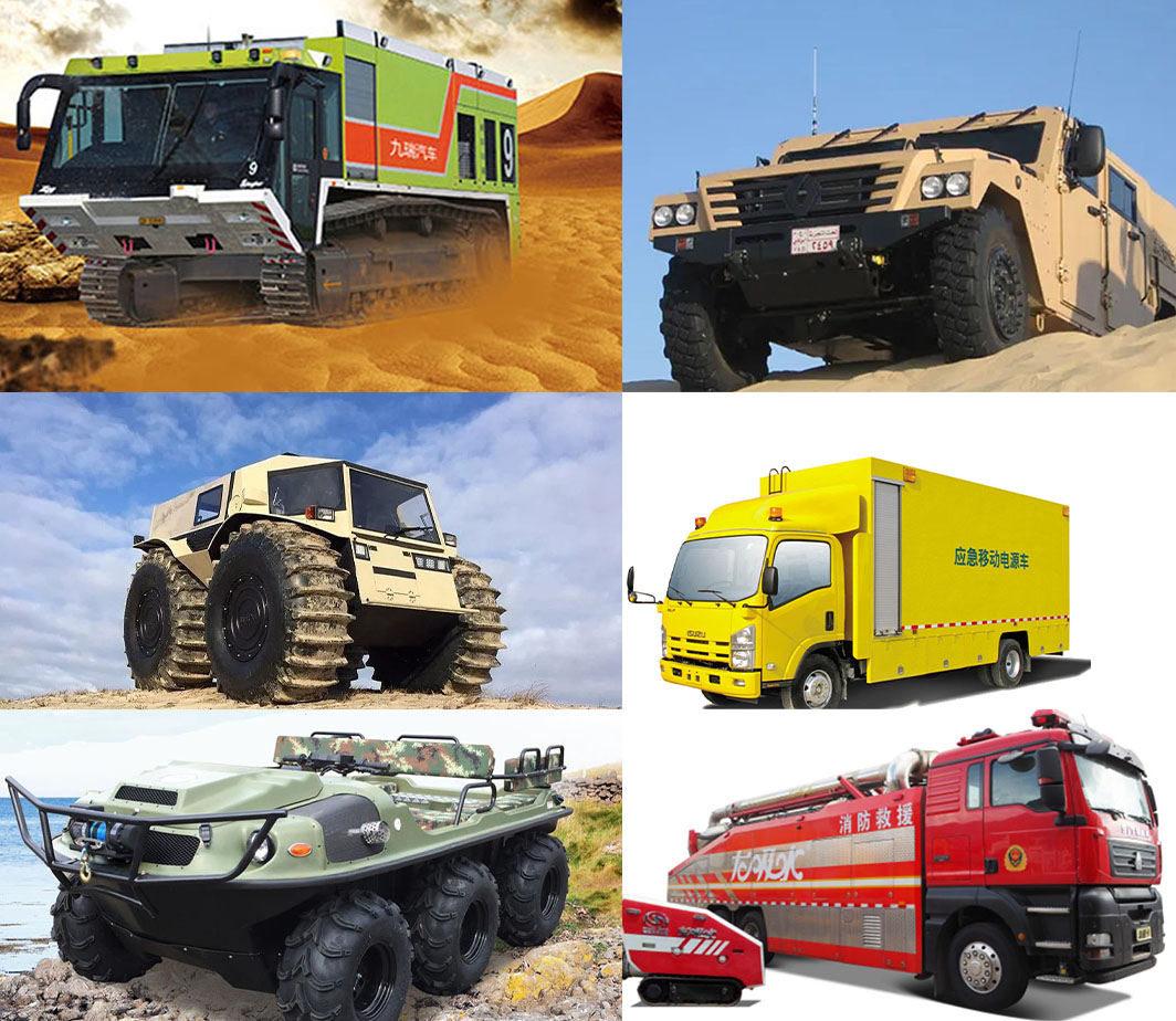 救護(hù)車、醫(yī)療車、軍警用車、商用車、指揮車、消防車、后勤保障車輛、領(lǐng)導(dǎo)專用車、多用途車(MPV)、電視轉(zhuǎn)播車、雷達(dá)車、軍事監(jiān)理車、X光檢查車、監(jiān)測(cè)車、越野車、清理除雪車、全地形車、水陸兩棲車、通信車、機(jī)場(chǎng)車、航天車、校車、清障車、房車、旅居車、清障車、環(huán)衛(wèi)車、市政專用車、裝卸車、工程救險(xiǎn)車、道路救援車、防彈運(yùn)鈔車、高空作業(yè)車、郵政車、起重車、攪拌車、挖掘車、推土車、油罐車、冷藏運(yùn)輸車、礦用載重車、集裝箱車、工程專用車、壓路車以及不同型改裝車輛等。